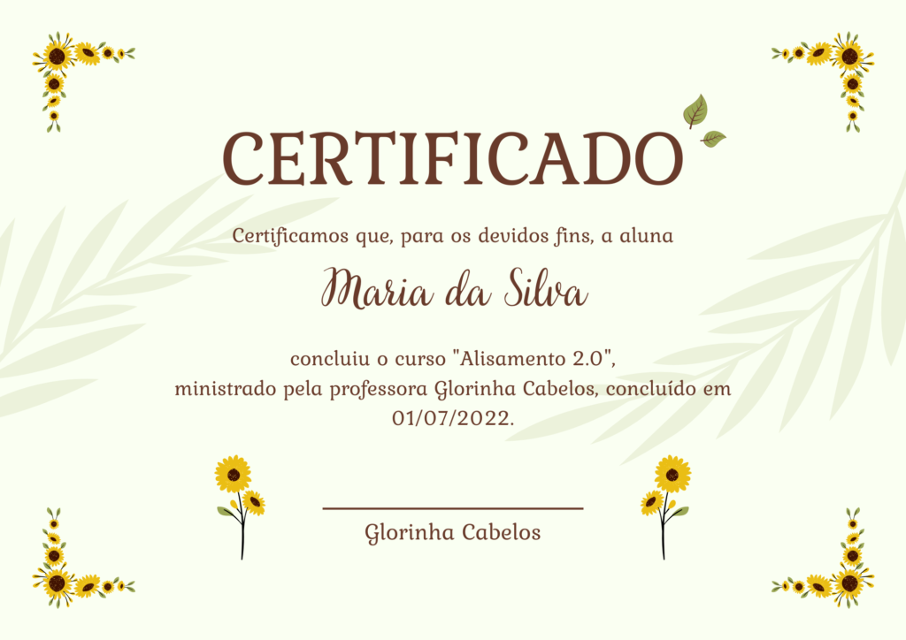 Após concluir o Curso Alisamento 2.0, você terá acesso a um lindo certificado de conclusão que você poderá emitir direto da sua área do aluno.